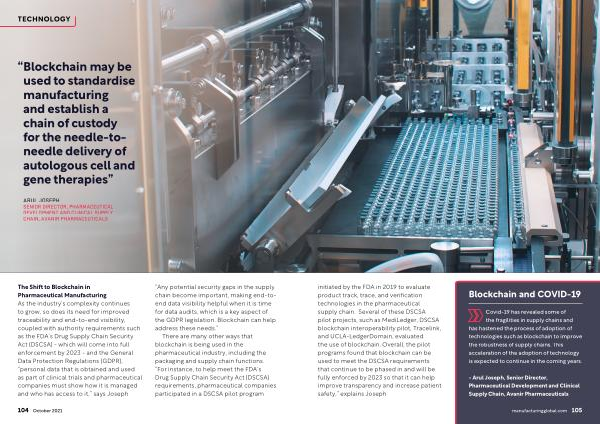 The Shift to Blockchain in Pharmaceutical Manufacturing As the industry ’ s complexity continues to grow , so does its need for improved traceability and end-to-end visibility , coupled with authority requirements such as the FDA ’ s Drug Supply Chain Security Act ( DSCSA ) - which will come into full enforcement by 2023 - and the General Data Protection Regulations ( GDPR ), “ personal data that is obtained and used as part of clinical trials and pharmaceutical companies must show how it is managed and who has access to it ,” says Joseph .