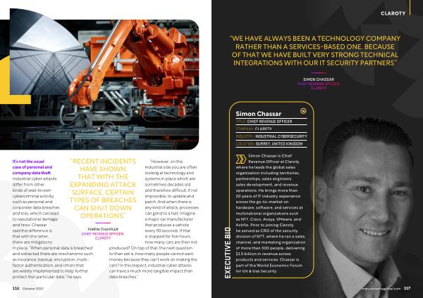 Revenue Officer at Claroty , where he leads the global sales organization including territories , partnerships , sales engineers , sales development , and revenue operations . He brings more than 20 years of IT industry experience across the go-to-market on hardware , software , and services at multinational organizations such as NTT , Cisco , Avaya , VMware , and Actifio . Prior to joining Claroty , he served as CRO of the security division of NTT , where he ran a sales , channel , and marketing organization of more than 300 people , delivering $ 1.5 billion in revenue across products and services . Chassar is part of the World Economic Forum for Oil & Gas Security . manufacturingglobal . com 117