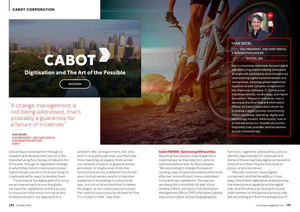 “ If you look at the digital part of it , since we are operating all across the globe , we have the capabilities and the access to resources to be more innovative and entrepreneurial in our approach to a problem . We can experiment , test , and pilot in one particular area , and then take those learnings and apply them across our network of plants or global business processes , or maybe even from one functional area into a different functional area . And yet we are careful to maintain a balance of innovating in a structured way , but not so structured that it creates blockages , as any creative person knows , the creative juices must be allowed to flow . It ’ s in Cabot ’ s DNA ,” says Skerl .