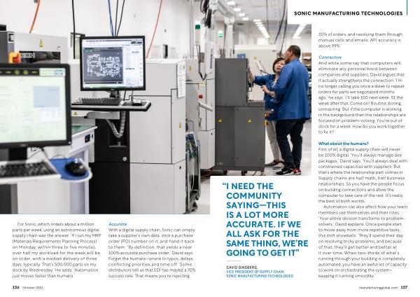 For Sonic , which orders about a million parts per week , using an autonomous digital supply chain was the answer . ‘ If I run my MRP ( Materials Requirements Planning Process ) on Monday , within three to five minutes , over half my workload for the week will be on order , with a median delivery of three days , typically . That ’ s 500,000 parts on my dock by Wednesday .’ He adds : ‘ Automation just moves faster than humans .’