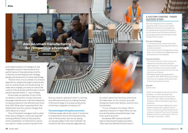 The technologies driving the movement Culshaw speaks about the cloud . It took time to implement it across the manufacturing side of the business , but we are seeing our people adapt to the new methods . He mentions that Atos employs edge devices