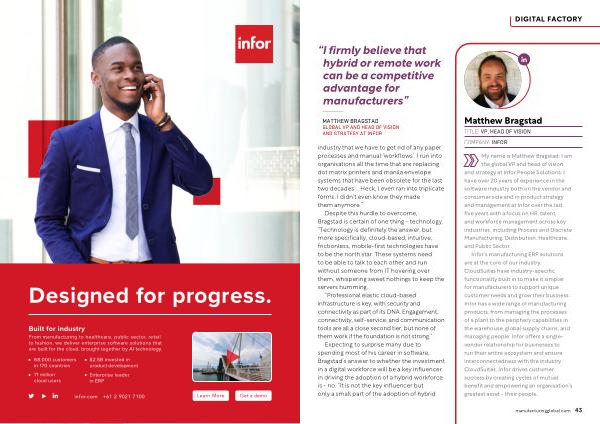 “ I firmly believe that hybrid or remote work can be a competitive advantage for manufacturers ” MATTHEW BRAGSTAD GLOBAL VP AND HEAD OF VISION AND STRATEGY AT INFOR