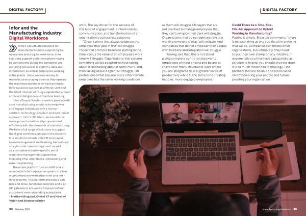 Could There be a ‘ One-Size- Fits-All ’ Approach to Hybrid Working in Manufacturing ? Putting it simply , Bragstad comments : “ there is no such thing as one size fits all in anything that we do . Companies can model other organisations , but ultimately , they need to put their own stamp on any initiative . If anyone tells you they have a plug and play solution to hybrid , you should shut the door . It is so much more than technology . Find partners that are flexible and are focused on empowering your people and futureproofing your organisation .”