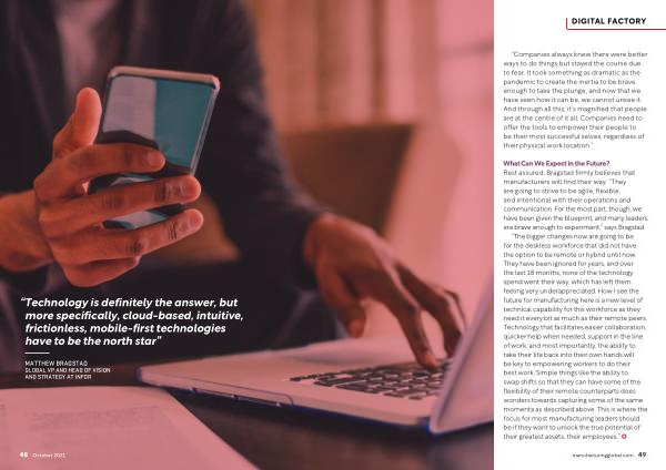 “ The bigger changes now are going to be for the deskless workforce that did not have the option to be remote or hybrid until now . They have been ignored for years , and over the last 18 months , none of the technology spend went their way , which has left them feeling very underappreciated . How I see the future for manufacturing here is a new level of technical capability for this workforce as they need it every bit as much as their remote peers . Technology that facilitates easier collaboration , quicker help when needed , support in the line of work , and most importantly , the ability to take their life back into their own hands will be key to empowering workers to do their best work . Simple things like the ability to swap shifts so that they can have some of the flexibility of their remote counterparts does wonders towards capturing some of the same momenta as described above . This is where the focus for most manufacturing leaders should be if they want to unlock the true potential of their greatest assets , their employees .”
