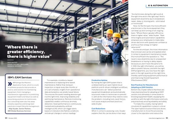 Application Suite , which is a suite of software products that provide an end-to-end solution for maintaining equipment , from managing a maintenance organisation to predicting equipment health and failure as well as prescribing solutions for technicians . Our consulting team also has deep industry expertise and brings best practices in asset lifecycle management . - Skip Snyder , Senior Partner , IBM Global Business Services