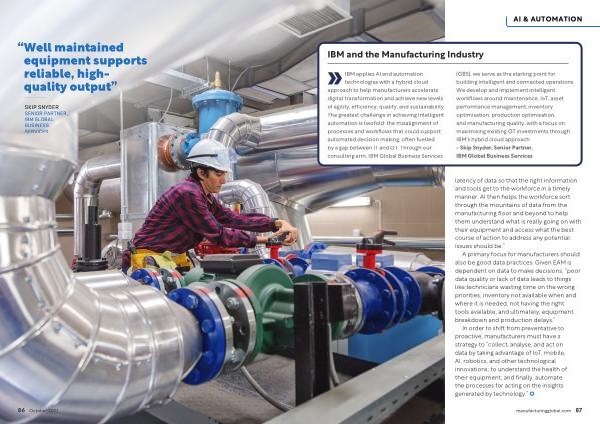 ( GBS ), we serve as the starting point for building intelligent and connected operations . We develop and implement intelligent workflows around maintenance , IoT , asset performance management , inventory optimisation , production optimisation , and manufacturing quality , with a focus on maximising existing OT investments through IBM ’ s hybrid cloud approach . - Skip Snyder , Senior Partner , IBM Global Business Services